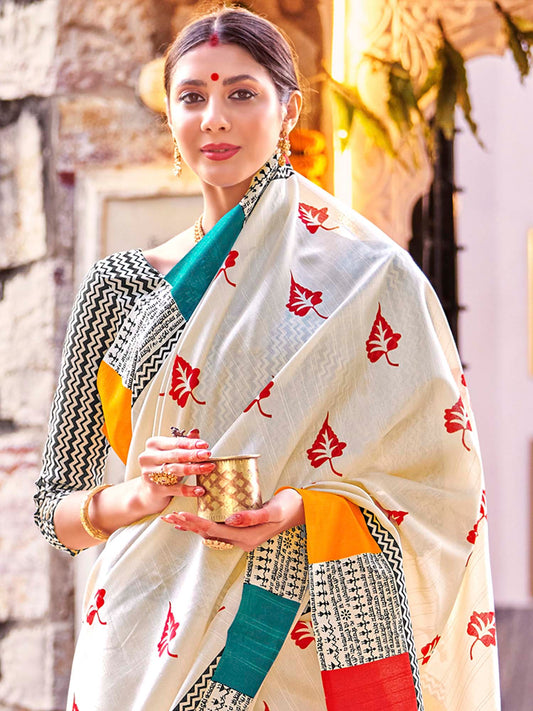 Women's Bhagalpuri Silk Cream Printed Designer Saree With Blouse Piece