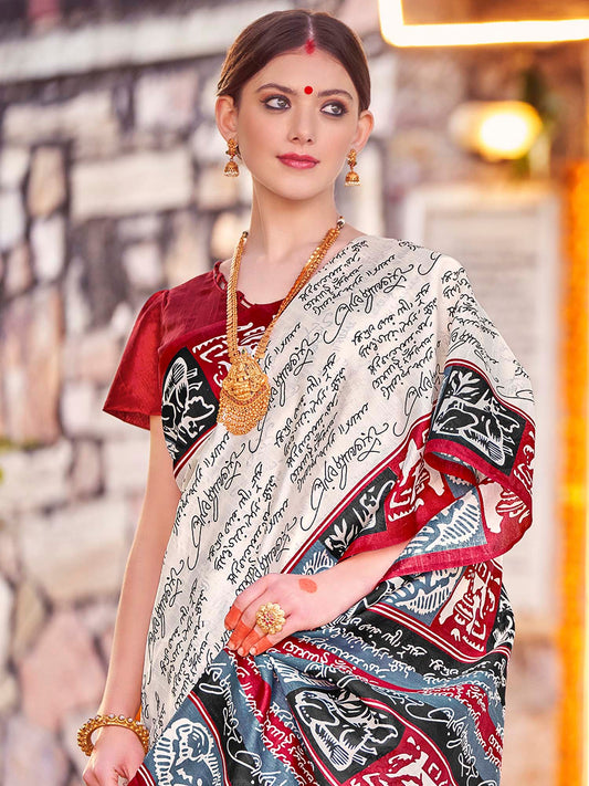 Women's Bhagalpuri Silk Off White Printed Designer Saree With Blouse Piece