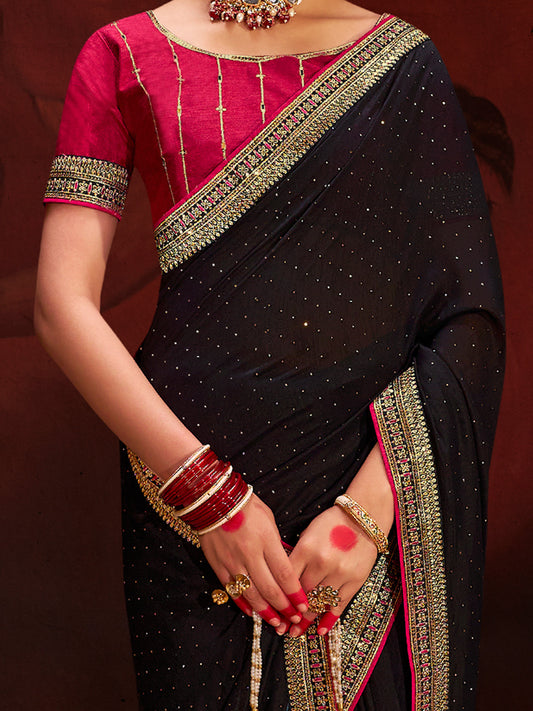 Women's Vichitra Silk Black Embellished Designer Saree With Blouse Piece