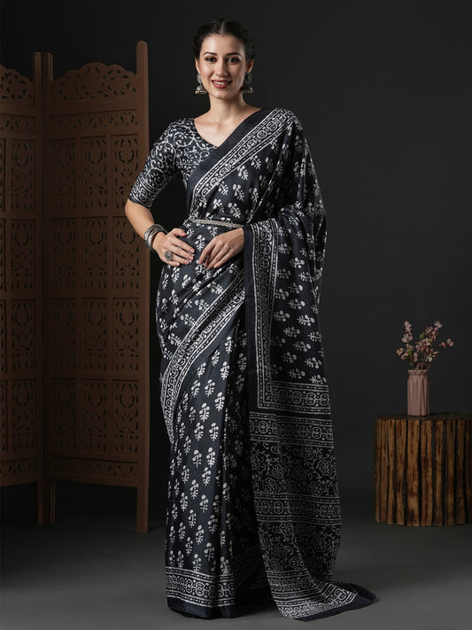 Women's Bhagalpuri Silk Black Printed Designer Saree With Blouse Piece
