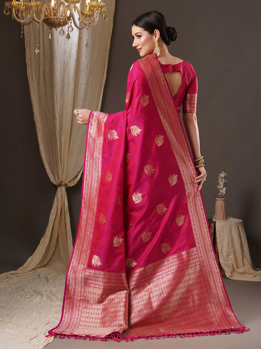 Women's Pure Silk Pink Woven Design Designer Saree With Blouse Piece