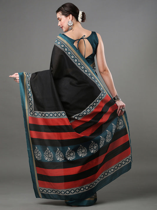Women's Bhagalpuri Silk Black Printed Designer Saree With Blouse Piece
