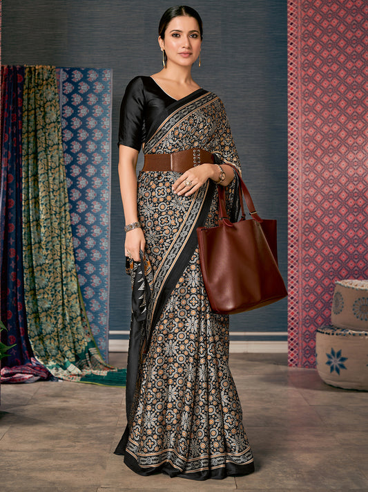 Women's Crepe Black Digital Print Designer Saree With Blouse Piece