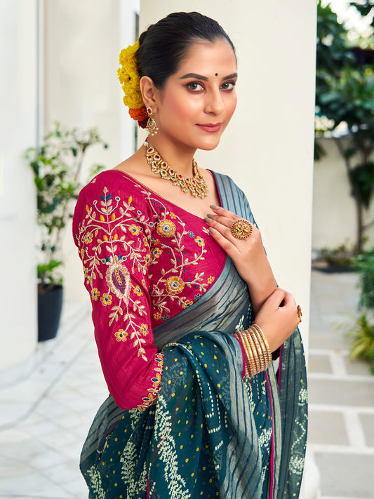 Women's Pure Chiffon Teal green Embellished Designer Saree With Blouse Piece