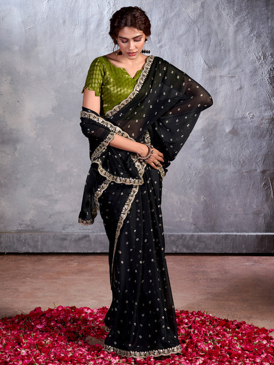 Women's Pure Chiffon Black Embellished Designer Saree With Blouse Piece