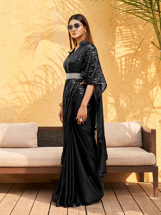 Dhiyona TI Women's Black Designer Sequinned Kaftan Pre Drapped Saree & Belt with Unstitched Blouse