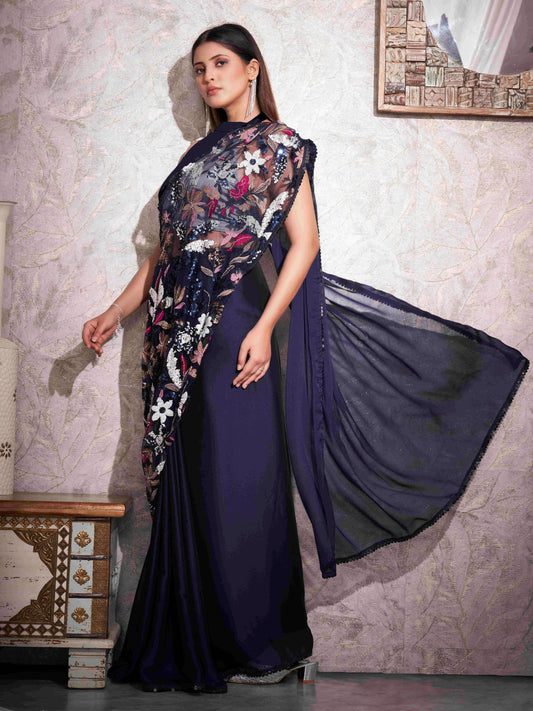 Women's Georgette Violet Embellished Designer Saree With Blouse Piece