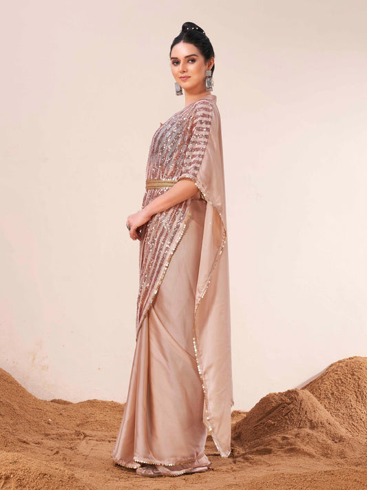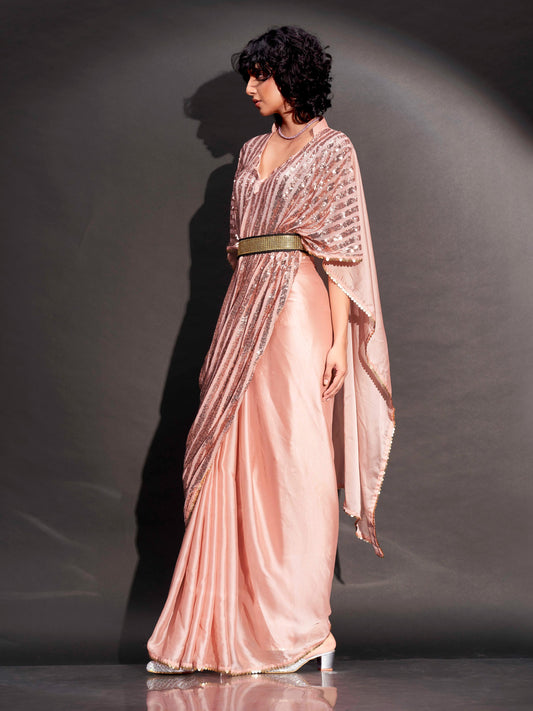 Dhiyona TI Women's Peach Designer Sequinned Kaftan Saree & Belt with Unstitched Blouse