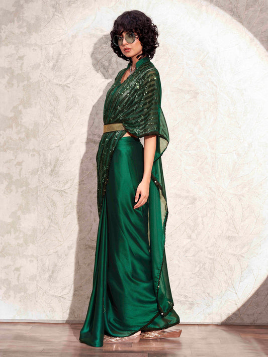 Dhiyona TI Women's Green Designer Sequinned Kaftan Saree & Belt with Unstitched Blouse