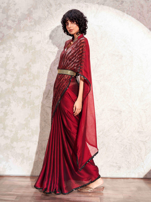 Dhiyona TI Women's Maroon Designer Sequinned Kaftan Saree & Belt with Unstitched Blouse