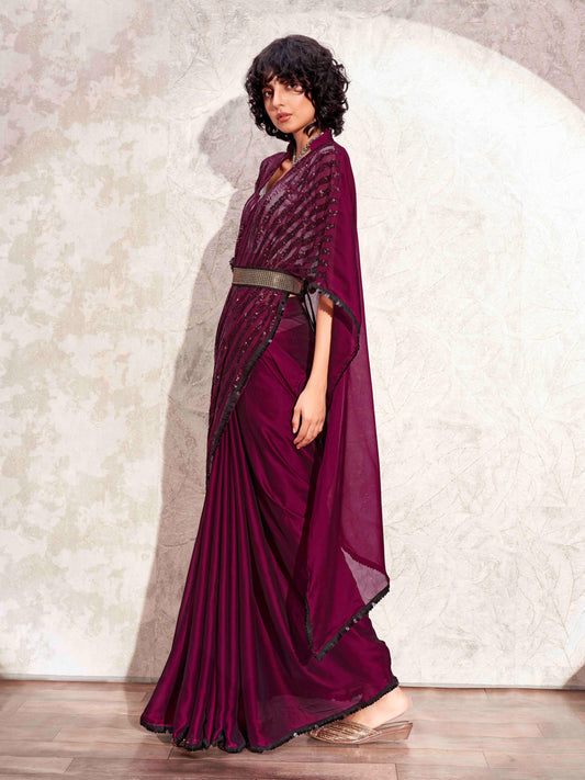 Dhiyona TI Women's Wine Designer Sequinned Kaftan Saree & Belt with Unstitched Blouse