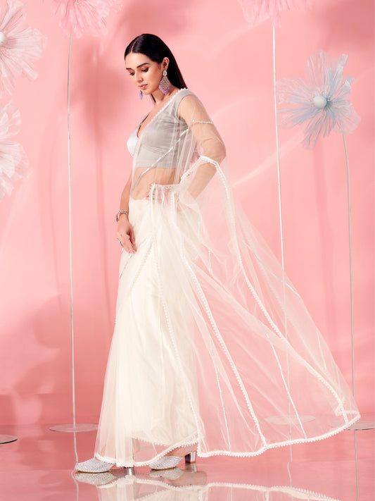 Dhiyona TI Women's Off White Coloured Designer Net Saree with Unstitched Blouse
