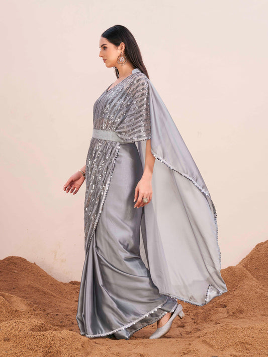 Dhiyona TI Women's Grey Colored Kaftan Designer Saree with Unstitched Blouse Embellished Belt
