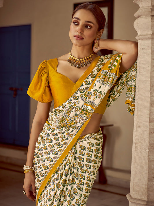 Women's Cotton Off White Printed Designer Saree With Blouse Piece