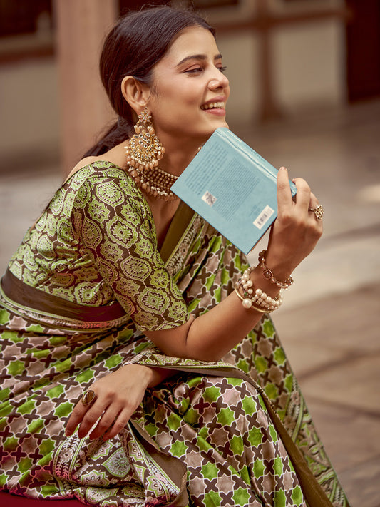 Women's Bhagalpuri Silk Camel Brown Printed Designer Saree With Blouse Piece