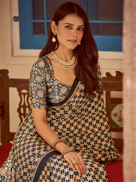 Women's Crepe Black Printed Designer Saree With Blouse Piece