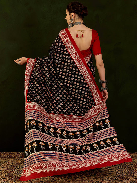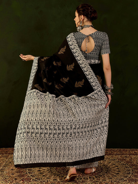 Women's Crepe Black Printed Designer Saree With Blouse Piece