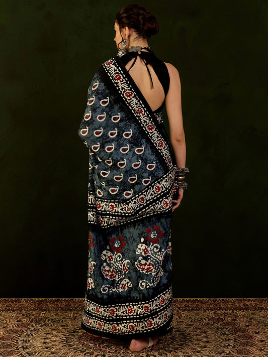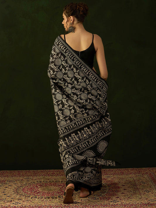 Women's Bhagalpuri Silk Black Printed Designer Saree With Blouse Piece