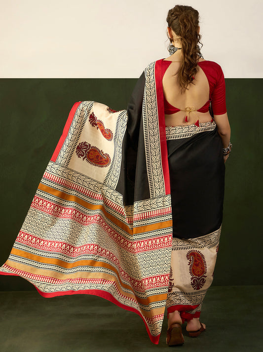 Women's Bhagalpuri Silk Black Printed Designer Saree With Blouse Piece