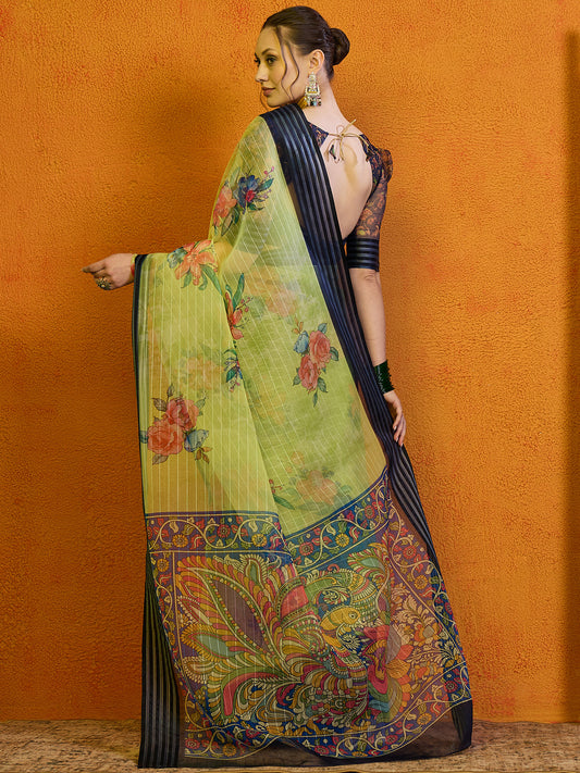 Women's Organza Green Printed Designer Saree With Blouse Piece