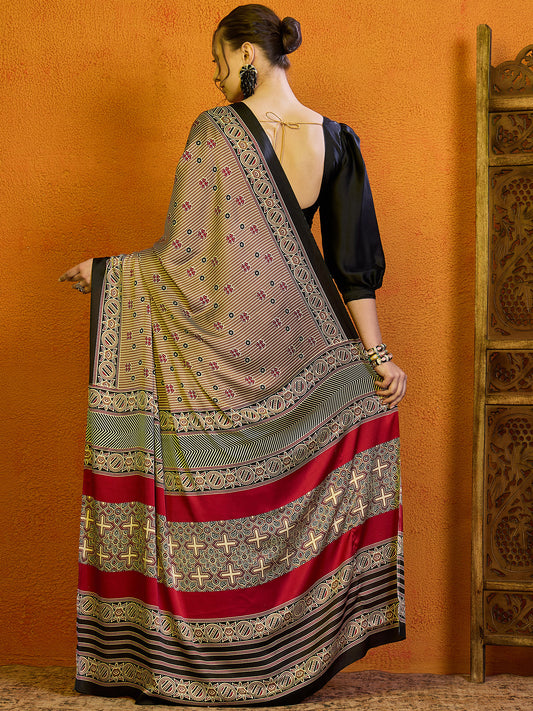 Women's Satin Brown Printed Designer Saree With Blouse Piece