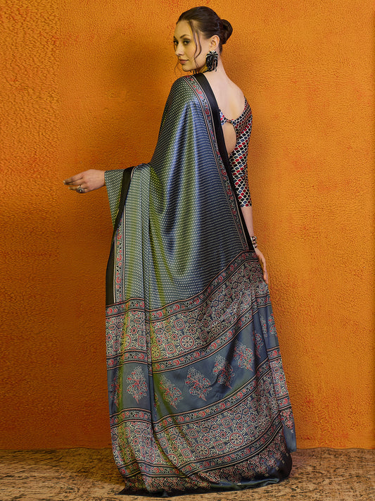 Women's Satin Grey Printed Designer Saree With Blouse Piece