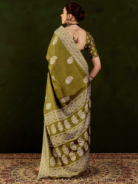 Women's Cotton Blend Olive Printed Designer Saree With Blouse Piece