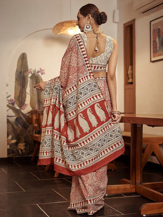 Women's Cotton Rust Printed Designer Saree With Blouse Piece