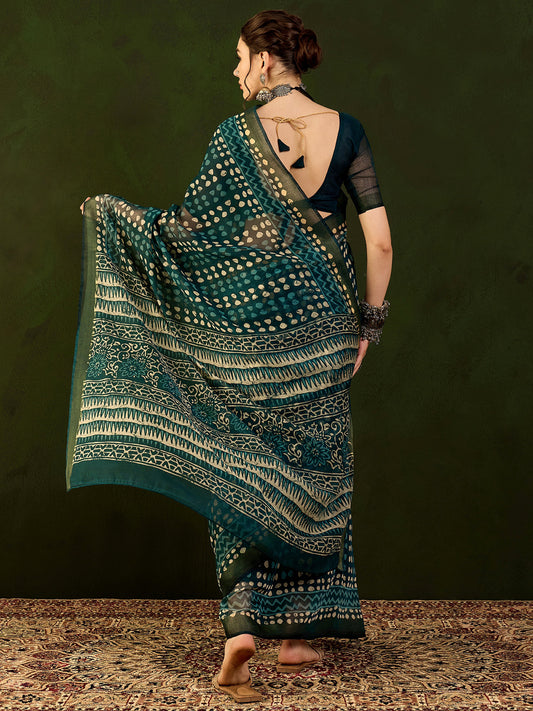 Women's Cotton Linen Teal blue Printed Designer Saree With Blouse Piece