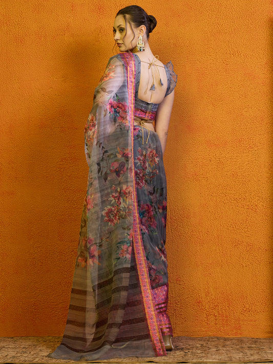 Women's Organza Grey Printed Designer Saree With Blouse Piece