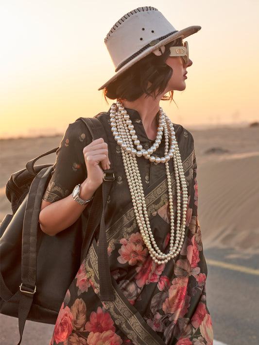 Women's Tissue Black Printed Designer Saree With Blouse Piece