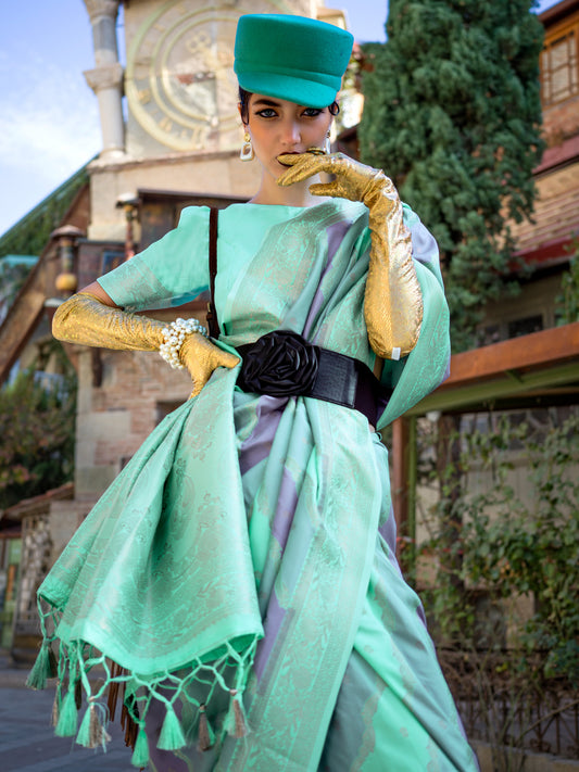 Women's Silk Blend Sea Green Woven Design Designer Saree With Blouse Piece
