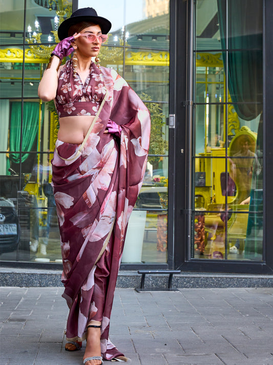 Women's Satin Silk Brown Printed Designer Saree With Blouse Piece