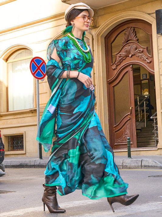 Women's Satin Silk Green Printed Designer Saree With Blouse Piece