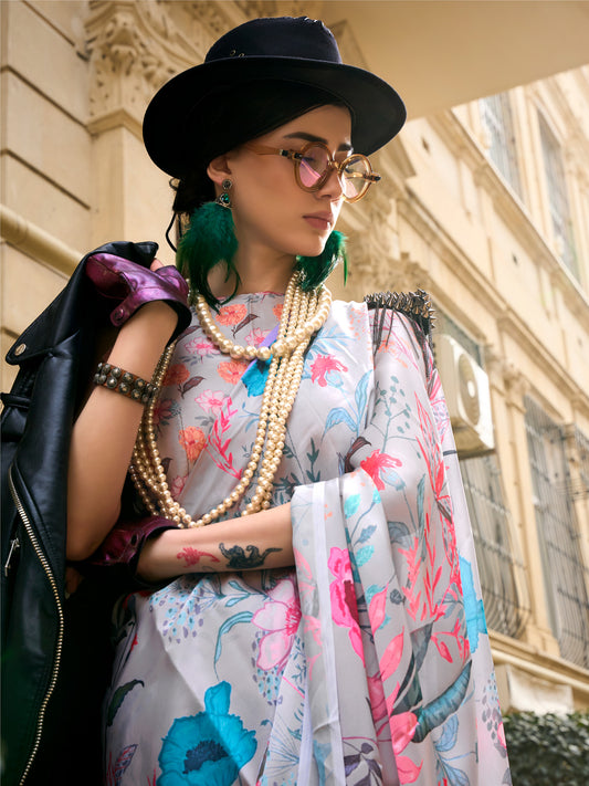 Women's Satin Silk Grey Printed Designer Saree With Blouse Piece