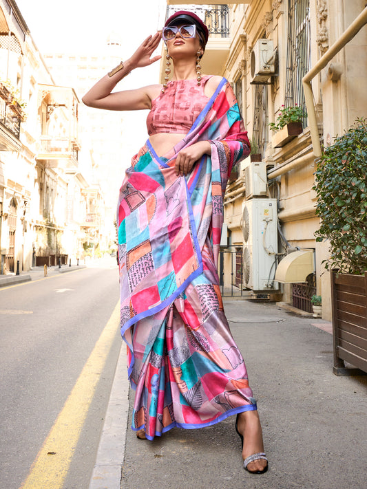 Women's Satin Silk Multicolored Printed Designer Saree With Blouse Piece