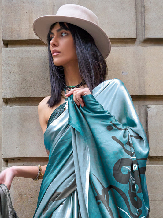 Women's Satin Grey Printed Designer Saree With Blouse Piece