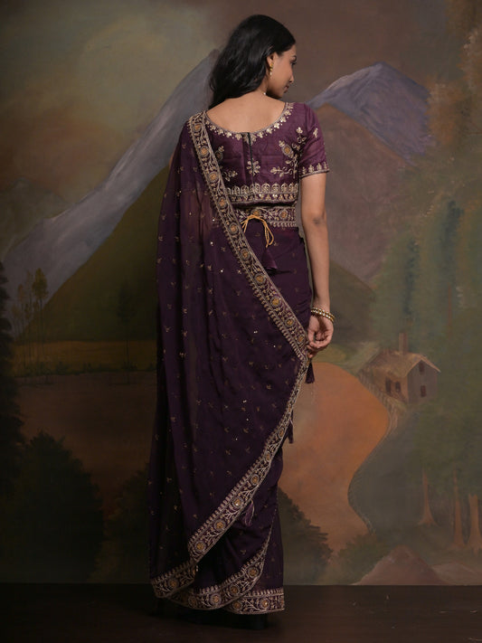 Women's Georgette Purple Embellished Designer Saree With Blouse Piece