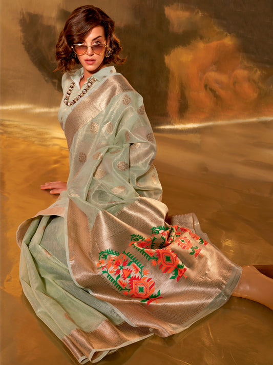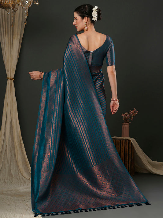 Women's Tissue Sea Green Woven Design Designer Saree With Blouse Piece