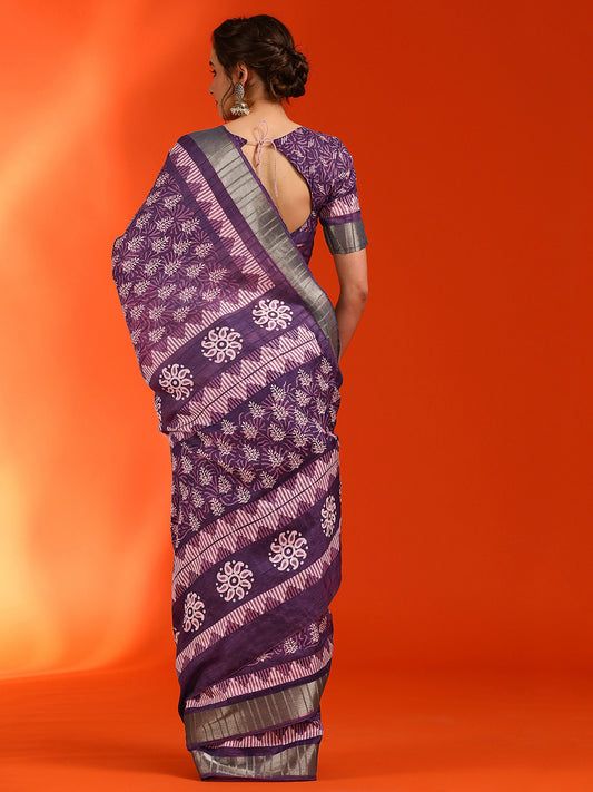 Women's Cotton Silk Violet Printed Designer Saree With Blouse Piece