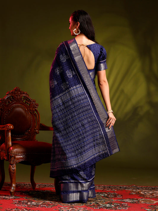 Women's Cotton Silk Navy Blue Printed Designer Saree With Blouse Piece