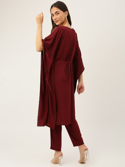 Women's Maroon Poly Crepe Kaftan Kurta with Pant