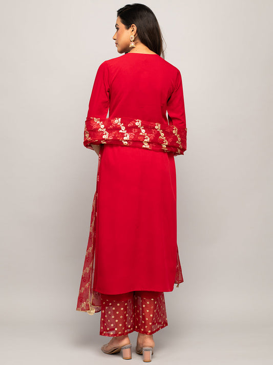 Women's Red Crepe A-line Kurta with Palazzo And Dupatta