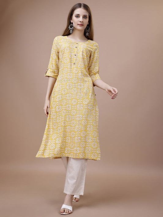 Dhiyona OD Yellow Floral Printed Round Neck Straight Kurta