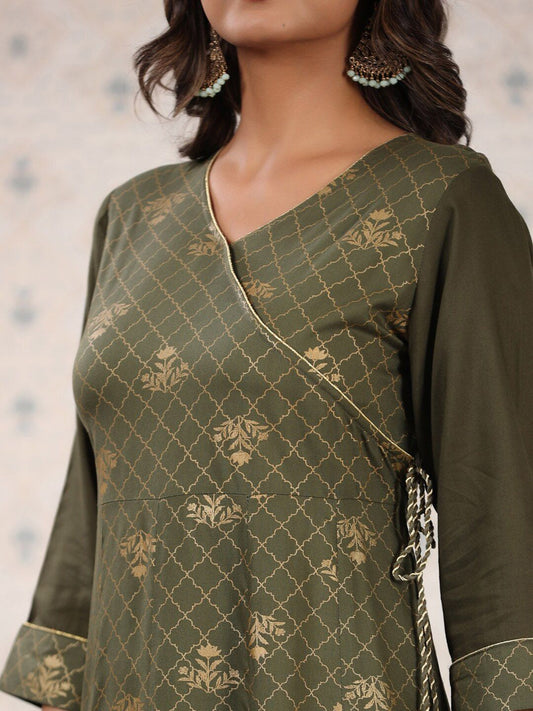 Dhiyona OD Olive Green & Gold Printed V Neck Angrakha Kurta With Palazzos