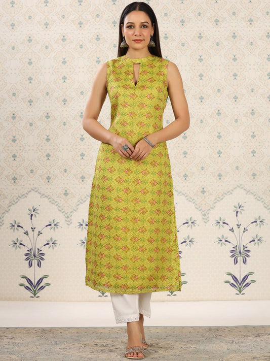 Dhiyona OD Green Floral Printed Keyhole Neck Straight Kurta