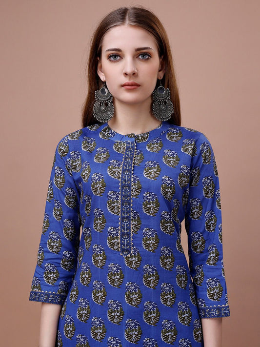 Dhiyona OD Floral Printed Band Collar Pure Cotton Kurta with Trousers