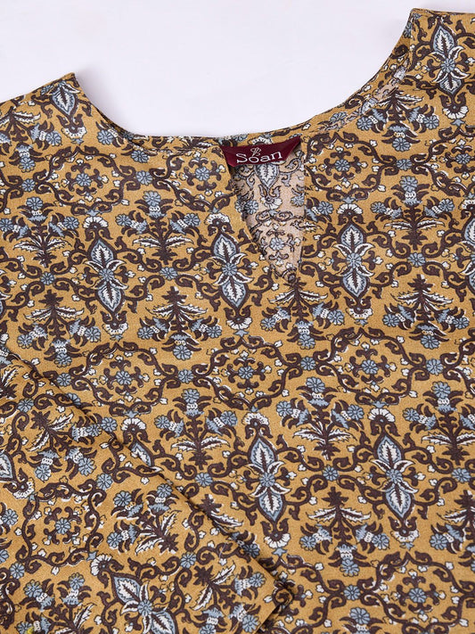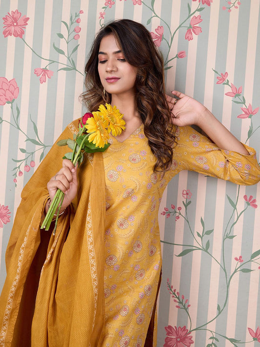 Dhiyona OD Printed Notched Neck Pure Cotton Kurta With Trousers & Dupatta