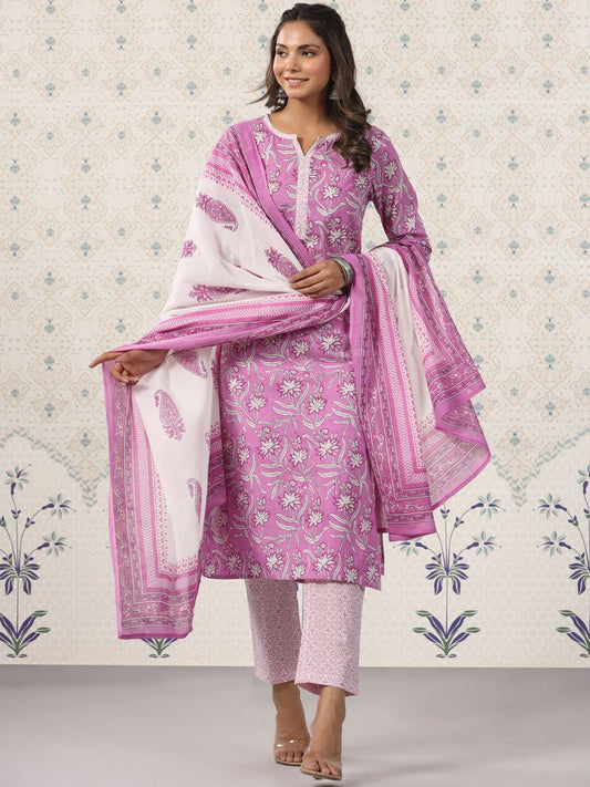 Dhiyona OD Floral Printed Regular Pure Cotton Kurta with Trousers & Dupatta