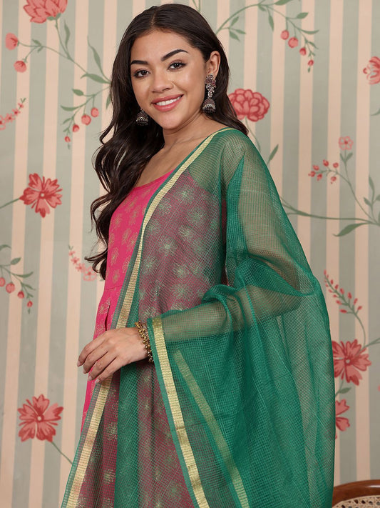 Dhiyona OD Pink Ethnic Motifs Embroidered Zari Kurta With Trousers & Dupatta